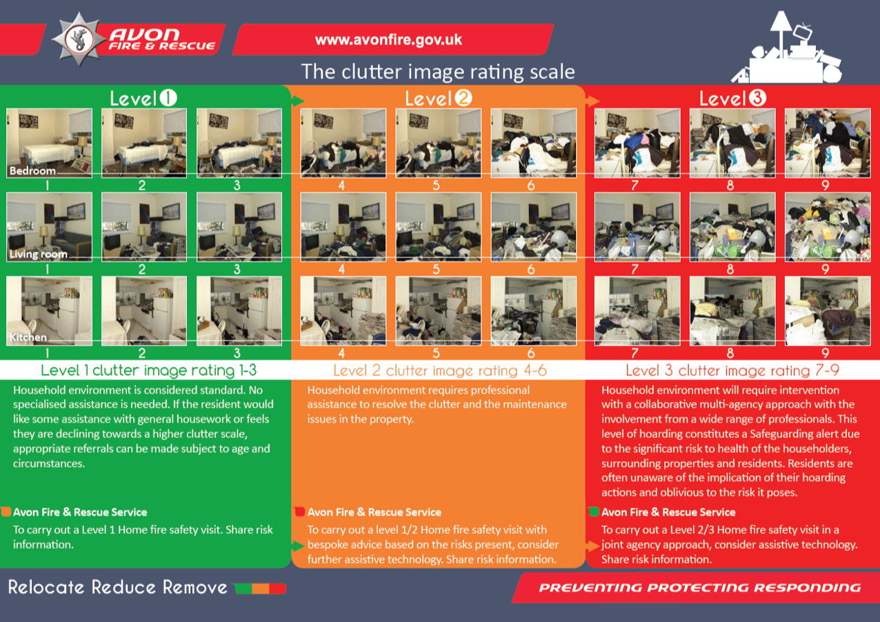 Hoarding is one of the most common forms of self-neglect and of course occurs to various degrees. This resource from Avon Fire and Rescue helps professionals to identify levels of hoarding and suggests appropriate courses of action: